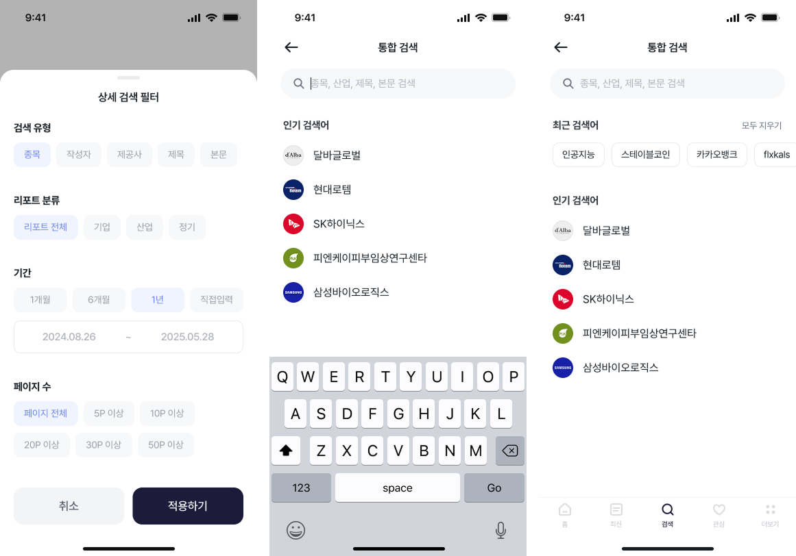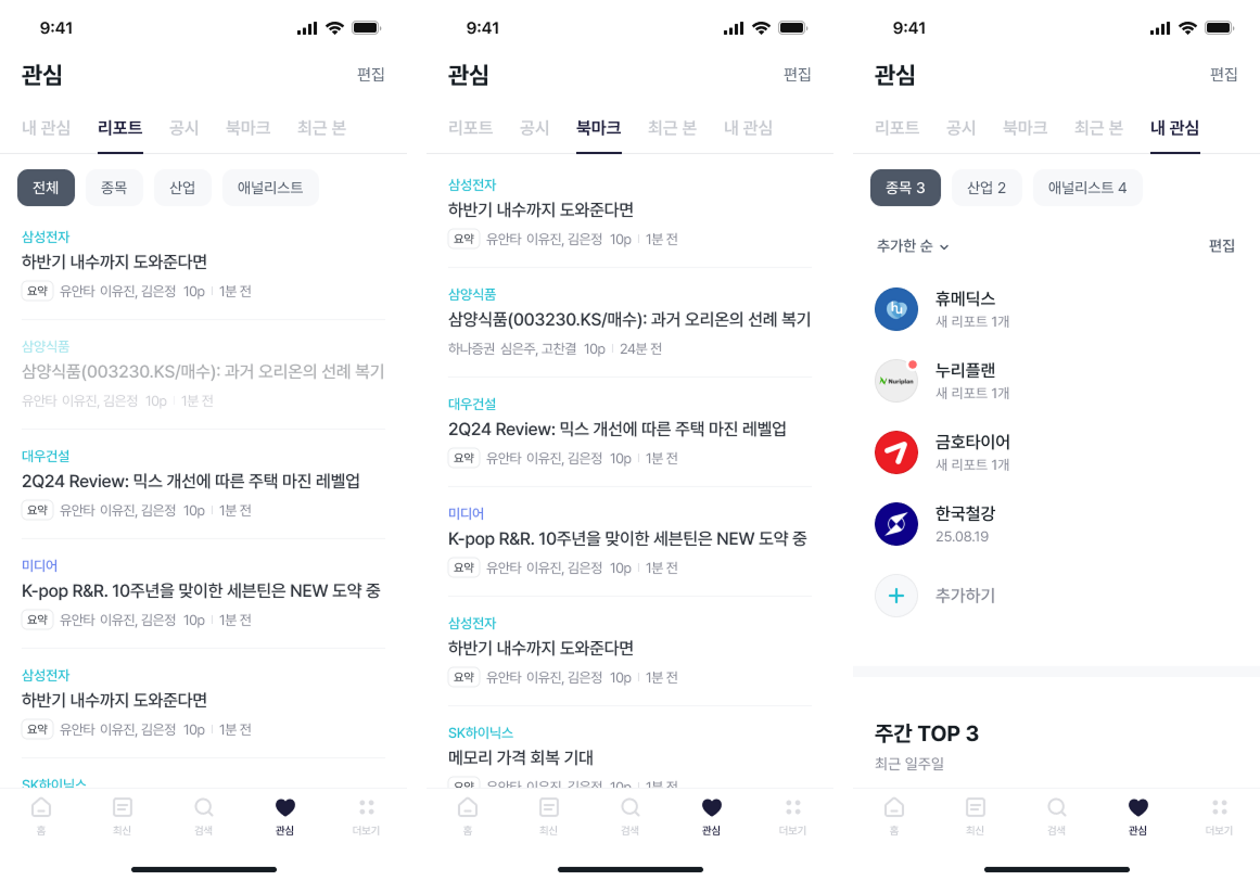 기존 분리되어 있던 마이리포트 탭과 공시 탭을 "관심" 메뉴로 통합했습니다.