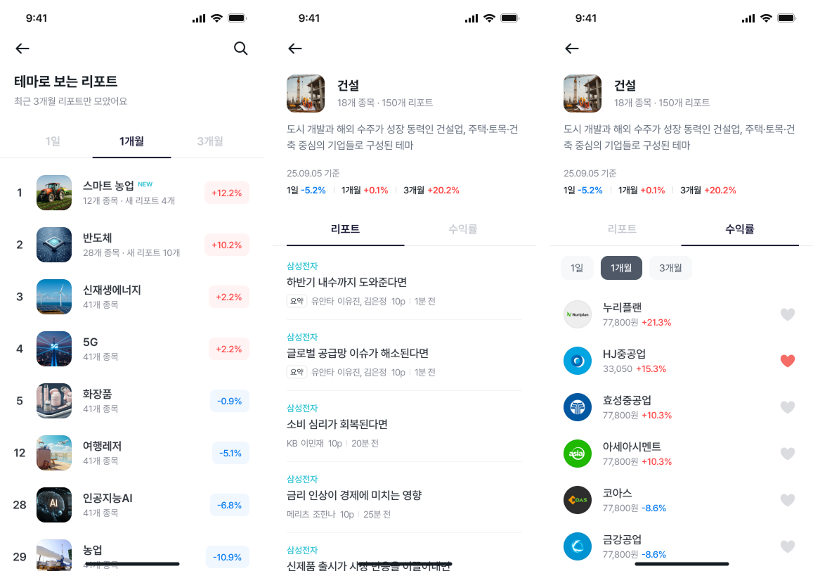 1일, 1개월, 3개월 별로 리포트를 모아볼 수 있고, 테마별 리포트와 수익률까지 한 번에 확인할 수 있도록 화면을 개선했습니다.