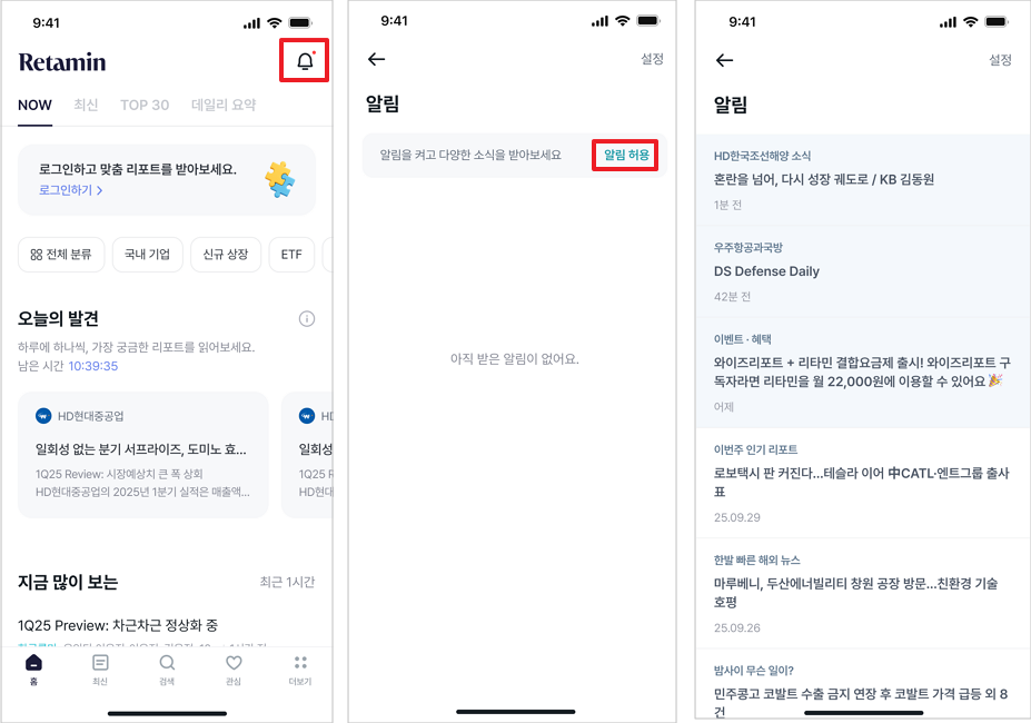 설정 후에는 관심 종목 소식과 주요 안내를 푸시로 받아볼 수 있어요.
