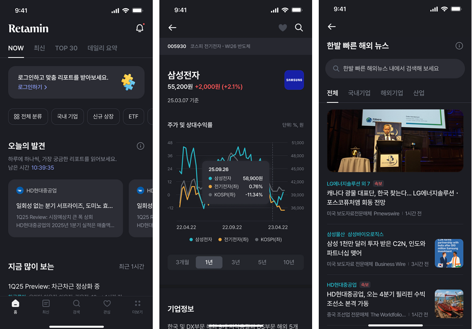 기업정보, 테마, 한발 빠른 해외뉴스까지 리타민의 모든 화면을 다크모드로 이용해 보세요.