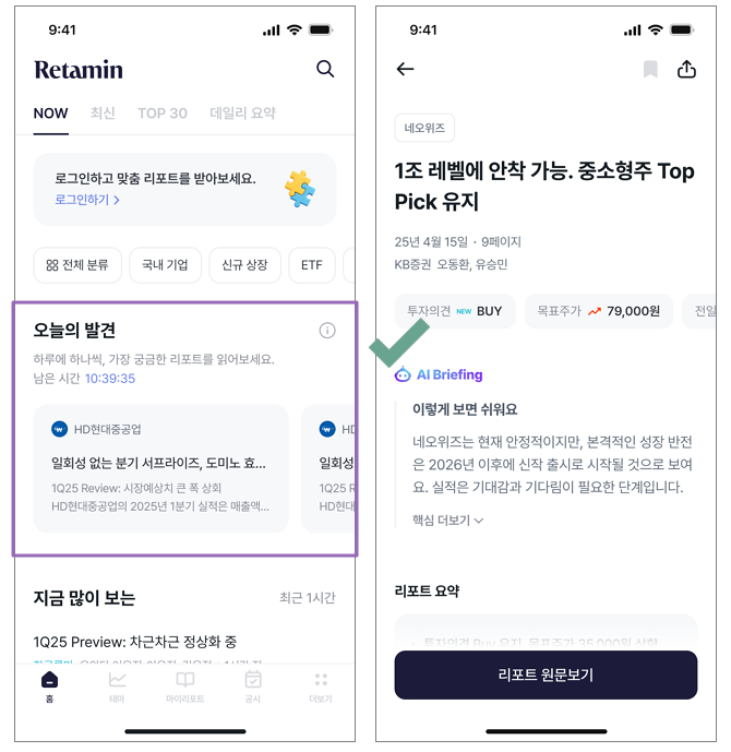 오늘의 발견 기능이 새롭게 추가됐어요!매일 아침, 시장에서 관심받는 종목 리포트를 확인해보세요.